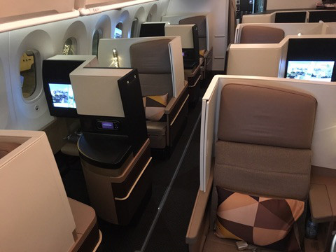 さて、肝心の機内ですが、シートはワンワールドでも採用されているもの、また、日本人はあまりお目にかかる機会はないようですが、さらに個人のプライバシーを守る仕切りのあるものなど好評です。僕はスタッガードで窓際が一番良いと思うのですが、窓際一列も悪くはありません。ただし、仕切り感は減ります。また2018年7月現在の成田線は古いものなのか、残念なシートでした。